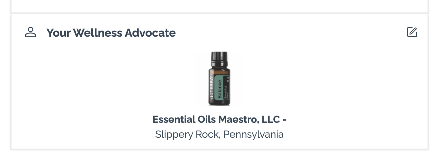 - Below the "Notifications" box, there's a box titled "Your Wellness Advocate." Essential Oils Maestro, LLC - Slippery Rock, Pennsylvania should already be showing. (See image below.) If it is showing, you may continue to the next step. Otherwise, read the additional directions below.